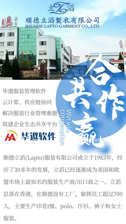 华遨软件是一家专业从事服装ERP管理软件和服装ERP管理系统的研发、销售以及售后一体化服务,为服装等行业提供一站式解决方案,帮助企业更好的规范和优化业务流程。成功导入案例上千个,总部+分公司案例、快反案例、生产加工厂案例等。样板-订单-采购-仓储-生产-报关-出货-财务等业务全覆盖,满足各中大型服装企业。